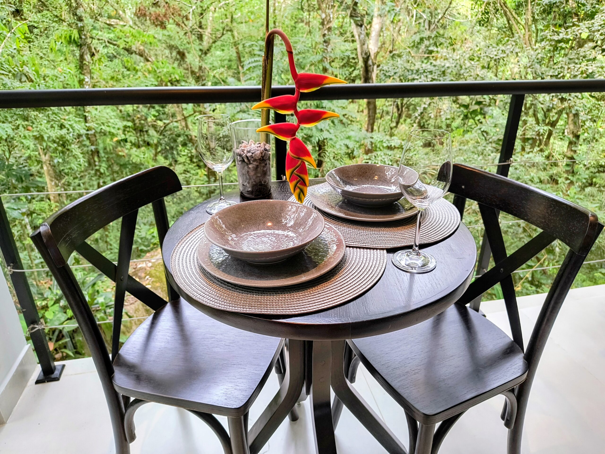 As Siriúba Suítes são duas suítes independentes, projetadas para casal, sob a casa container assinada por arquiteta. Aqui, o foco é privacidade, conforto e natureza real — com varanda gourmet e vista para a floresta.