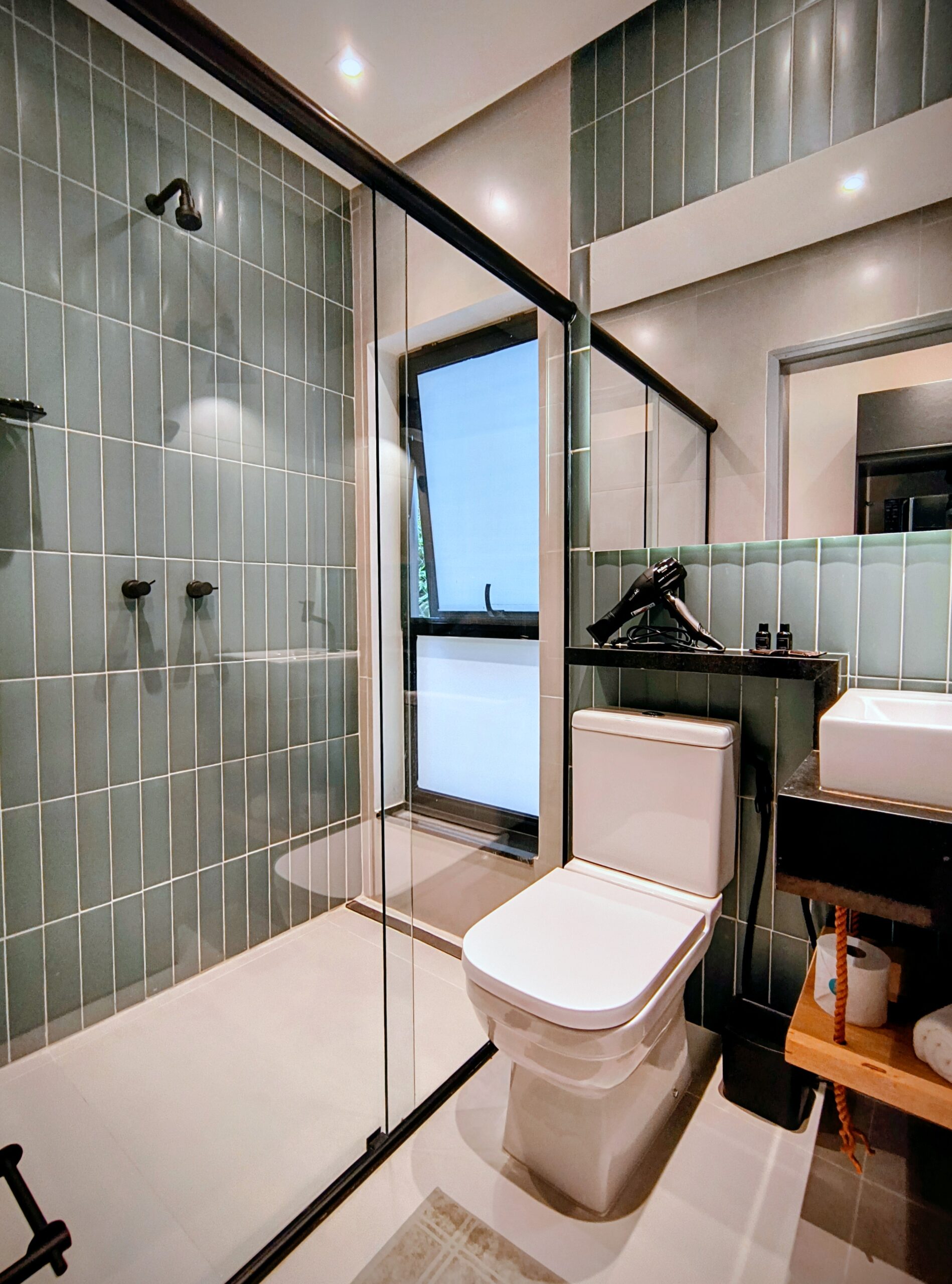 Banho “cachoeira quente” (água mineral filtrada e aquecida a gás) + cascata fria